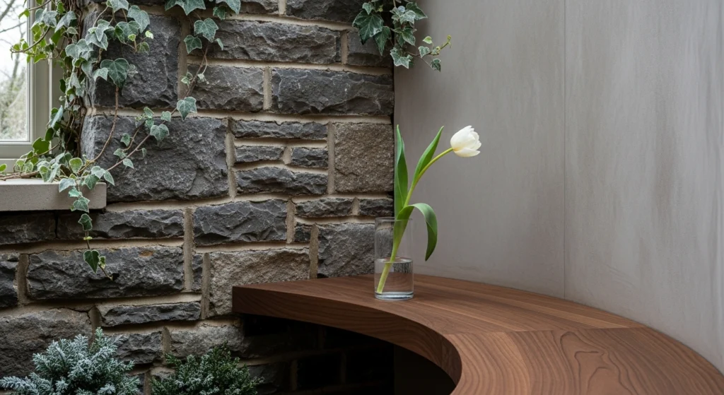 A winter garden nook utilizes the existing biological “Background Architecture” of the yard to create a tucked-away “Quiet Sanctuary.” We utilize the corner depth of a stone wall or evergreen hedge to install a custom walnut wrap-around bench, maximizing the footprint through “Zero-Waste Geometry.” The background features a sueded-texture Roman clay finish on a nearby pillar, which adds a layer of tactile warmth to the cold outdoor environment. We style this niche with a glass half-filled with water and a single long-stemmed white tulip to anchor the space in a state of curated discipline. This layout prioritizes the sensory experience of being “tucked in,” providing a sophisticated and permanent escape for quiet contemplation.