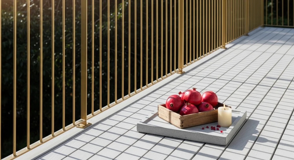 A “lived-in” winter porch represents the ultimate fusion of Stately Permanence and a “Collected and Creative” soul. This layout utilizes a repetitive architectural rhythm of pillars and slats, finished in a matte, bone-colored lacquer to match the home’s interior Bathroom or spa aesthetic. The floor is an expanse of wide-plank white oak, kept completely clear to prioritize “Visual Flow” and mental clarity. We style a central stone pedestal with a glass half-filled with water and a single long-stemmed white tulip next to a rustic wooden box of fresh spring pomegranates. This curated discipline ensures the porch remains a permanent sanctuary for restoration, where every element feels intentional and every shadow tells a story of modern excellence.