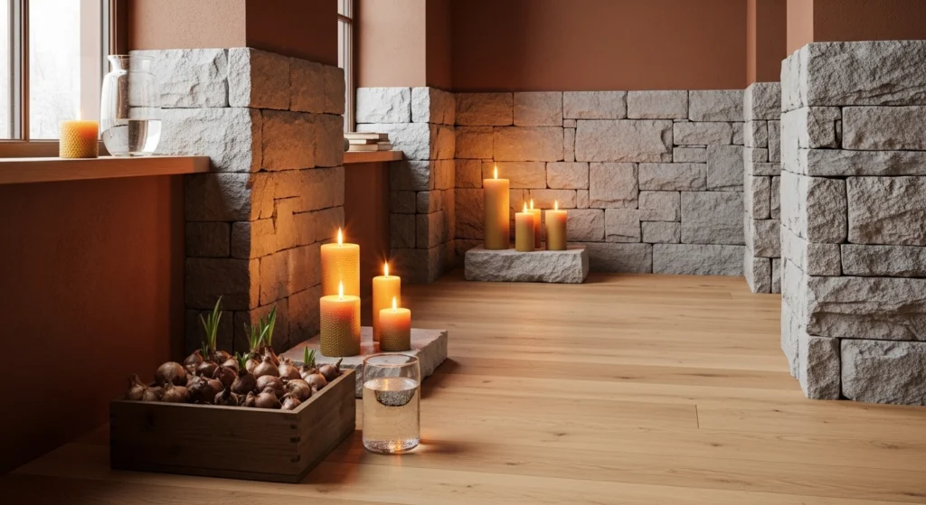 Thoughtful styling on a winter porch moves away from minimalism toward a “Collected and Creative” aesthetic that tells a story of high-end curation. This layout utilizes “Layered Materiality”—mixing wide-plank oak flooring, stone-clad walls, and brass hardware to create a multi-dimensional and tactile environment. The background features Roman clay exterior accents in a mushroom tone, adding a sueded depth to the structural lines of the porch. We style the space with “Active Decor”: a wooden box of specialized bulbs, a glass half-filled with water, and multiple burning beeswax candles on different stone levels. This layered approach ensures the porch feels like a restorative cocoon that is both sophisticated and deeply soulful for winter evening rest.