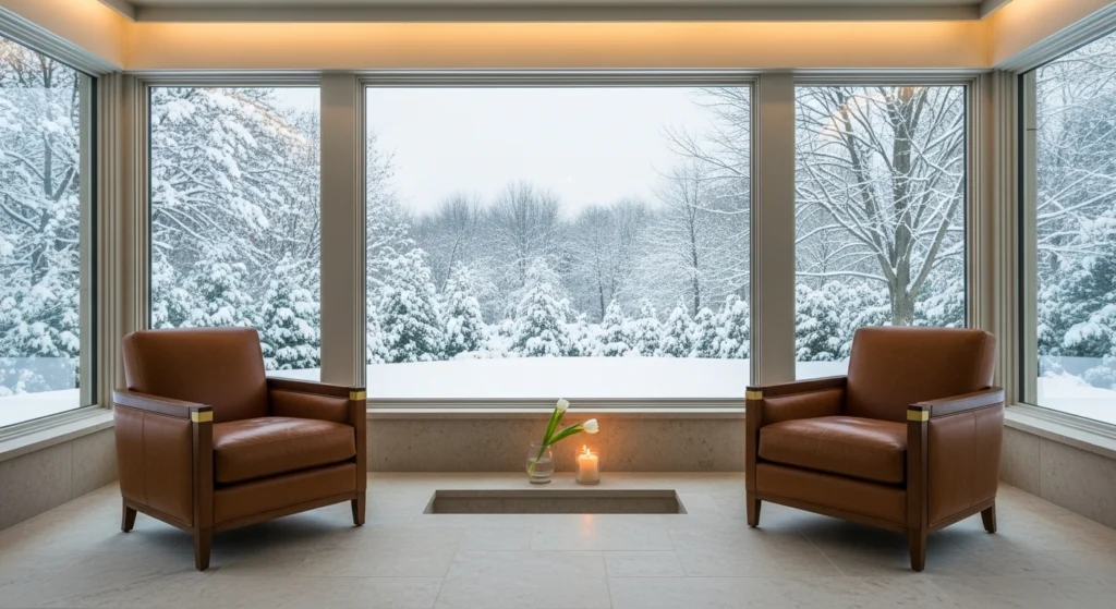 An enclosed winter porch utilizes the home’s “bones” to create a protective, year-round sanctuary that acts as a bridge between the Bedroom and the garden. This layout features floor-to-ceiling glass walls that maintain the “Visual Flow” while shielding the inhabitant from the element. We utilize Grounded Materiality by incorporating low-profile seating in cognac leather and a limestone floor that maintains a “Clean and Calm” horizon. We style an integrated wall niche with a glass half-filled with water and a single white tulip next to a burning beeswax candle. This disciplined approach transforms the enclosed space into a permanent and restorative anchor for quiet contemplation and daily revitalization.