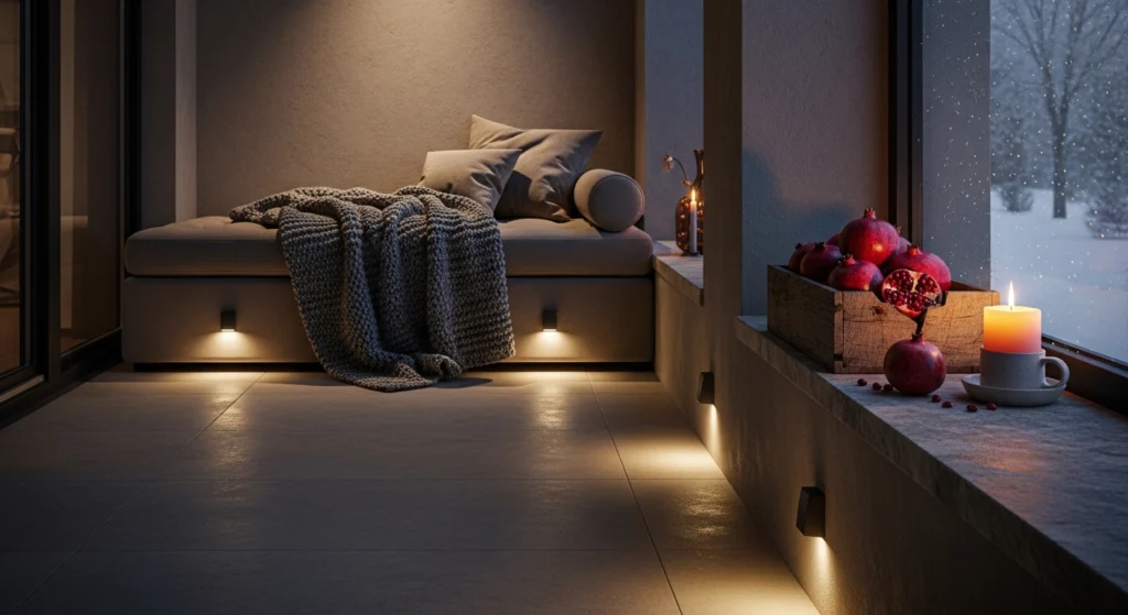 Evening elegance on a winter porch is achieved through the mastery of light and the strategic layering of high-fidelity materials. We utilize recessed LED floor lighting and brass reading sconces to highlight the texture of the Roman clay walls, creating a multi-dimensional and “Glowy” environment. The layout features an upholstered daybed in a neutral taupe, providing a sense of “Grounded Materiality” and restorative comfort for quiet evening reflection. We style a nearby stone ledge with a rustic wooden box of fresh spring pomegranates and a single flickering beeswax candle. This focus on the invisible architecture of light ensures the porch remains a sophisticated and permanent sanctuary, reflecting the modern homeowner’s appreciation for high-quality, atmospheric curation.