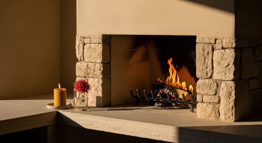 The fireside patio is the ultimate expression of “Hard Architecture” in winter, where a minimalist stone-clad fireplace provides both physical warmth and a structural focal point. We utilize sand-toned Roman clay for the hearth’s exterior, creating a sueded backdrop that catches the flickering light with high-intent precision. The layout is strictly governed by “Zero-Waste Geometry,” ensuring that seating is positioned to foster connection while maintaining a “Clean and Calm” horizon. We anchor the sensory experience with a burning beeswax candle on a limestone ledge next to a glass half-filled with water and a single dahlia. This fireside strategy ensures the patio remains a Living Room extension that celebrates the joy of curated hosting amidst the winter chill.
