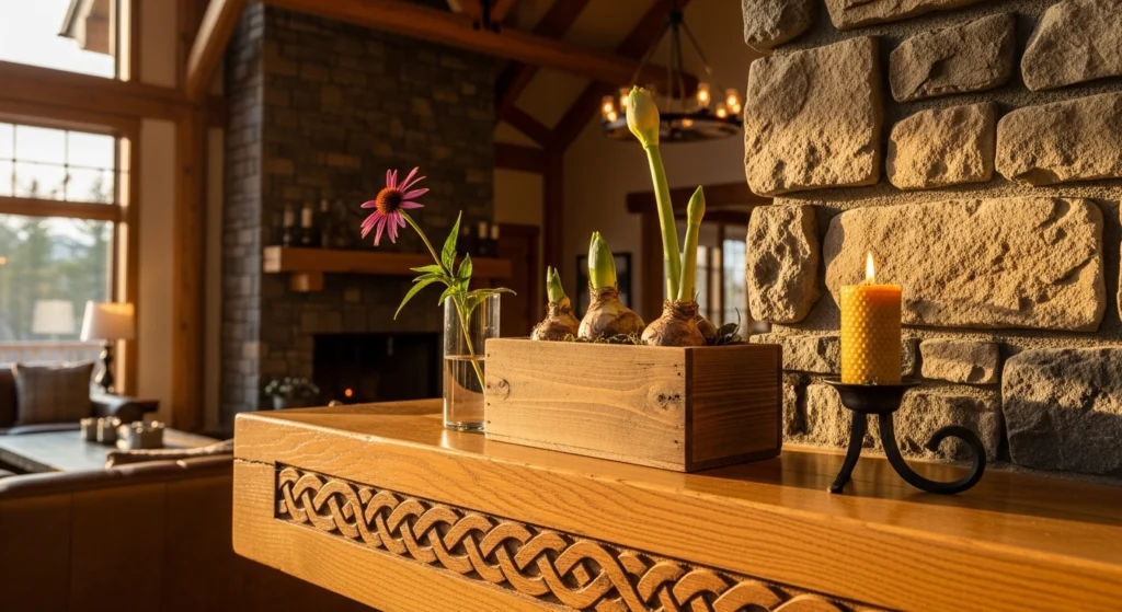 The lodge-style retreat celebrates the raw honesty of natural materials, utilizing hand-hewn timber and weathered stone to achieve a sense of Stately Permanence. This layout is designed to feel warm and intimate, mirroring the “Soft Soul” of a countryside Dining Room transition. To keep the look sophisticated, we maintain “Visual Silence” through high-intent furniture placement and hidden storage solutions within built-in stone benches. We style a heavy timber ledge with a wooden box of specialized bulbs, a burning beeswax candle, and a glass half-filled with water with a wildflower. This rustic, grounded approach ensures the retreat feels like a permanent and restorative part of the earth, providing a timeless sanctuary for curated social connection.