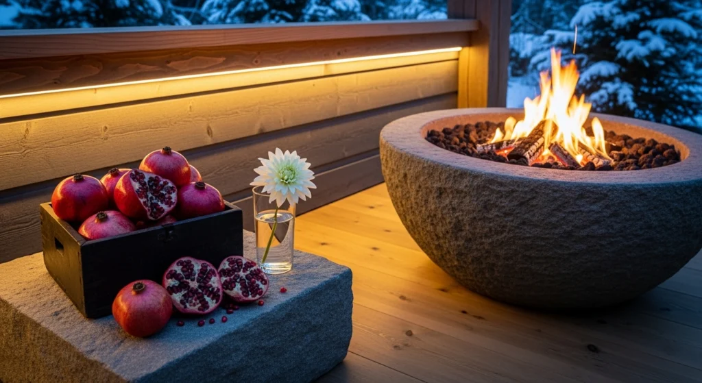 Rustic comfort in winter is found through the balance of heavy, un-cut stone and the “Soft Soul” of glowing string lights. This layout positions a large stone fire bowl as the central anchor, allowing the light to highlight the raw honesty of the masonry and the wide-plank oak floor. To maintain architectural integrity, we avoid “Visual Noise” by using hidden lighting within the eaves of the porch structure. We style a nearby stone plinth with a rustic wooden box of fresh pomegranates and a single glass of water with a white dahlia. This approach creates an environment that feels like a “Sun-Washed” extension of the earth, providing a high-end retreat for those who appreciate the intersection of human design and natural beauty.