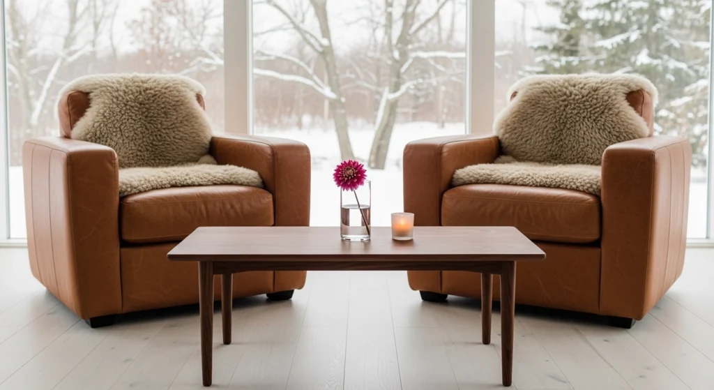 Effortless coziness on a winter porch is achieved through the masterful layering of high-fidelity textiles and “Soft Soul” details. We utilize oversized cognac leather armchairs and deep-seated linen sofas to create an inviting environment that balances the “Hard Architecture” of the home’s structure. The layout is optimized for captured sun-light, positioned to catch the sun-washed clarity of the winter morning across the wide-plank white oak floors. We style the seating area with a glass half-filled with water and a single dahlia on a minimalist walnut side table next to a burning candle. This approach turns the back porch into a private sanctuary that feels like an expansive extension of the home, offering a tranquil retreat for restorative rest.