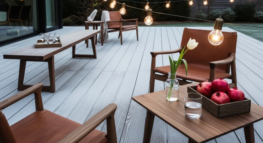 Creating a winter retreat under the open sky requires a commitment to “Layered Lighting” that avoids the “Visual Noise” of festive overdecoration. We utilize a single strand of oversized, brass-socket string lights to cast a “Glowy” energy across the wide-plank white oak decking, highlighting the frost-etched grain of the timber. The layout is anchored by a low-profile walnut bench and cognac leather lounge chairs, providing a sense of Grounded Materiality that feels permanent and protective. We style this social sanctuary with a rustic wooden box holding fresh spring pomegranates and a glass half-filled with water with a single white tulip. This disciplined approach ensures that the “Visual Flow” toward the Outdoor Garden remains clear, offering a high-end sanctuary for twilight reflection.