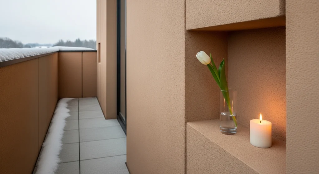 Transforming a winter balcony into a warm sanctuary requires a commitment to “Zero-Waste Geometry” and vertical integration. By using tall, handle-less built-in storage to hide winter Home Essentials and a seamless floor of limestone pavers, you create a high-fidelity sanctuary in a limited footprint. The walls are finished in a sand-toned Roman clay, creating a sueded backdrop that makes the narrow space feel more expansive and “Sun-Washed.” We style a small integrated niche with a glass half-filled with water and a single white tulip next to a burning candle. This layout proves that even an urban balcony can be a restorative cocoon when approached with Shed Pub architectural discipline and a focus on “Visual Silence.”