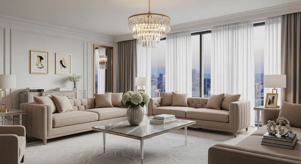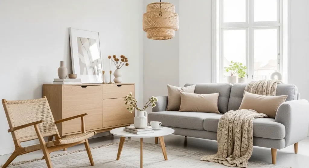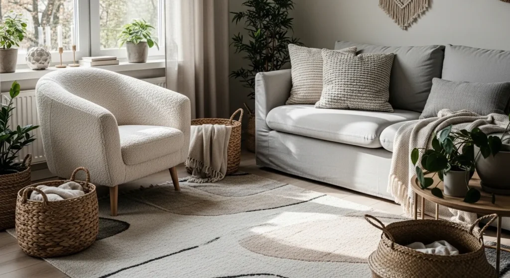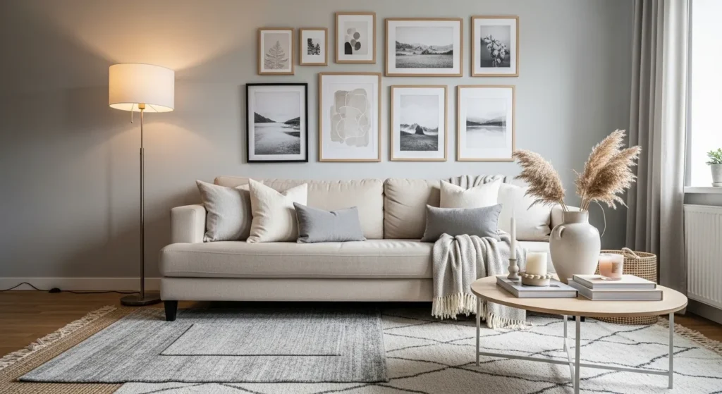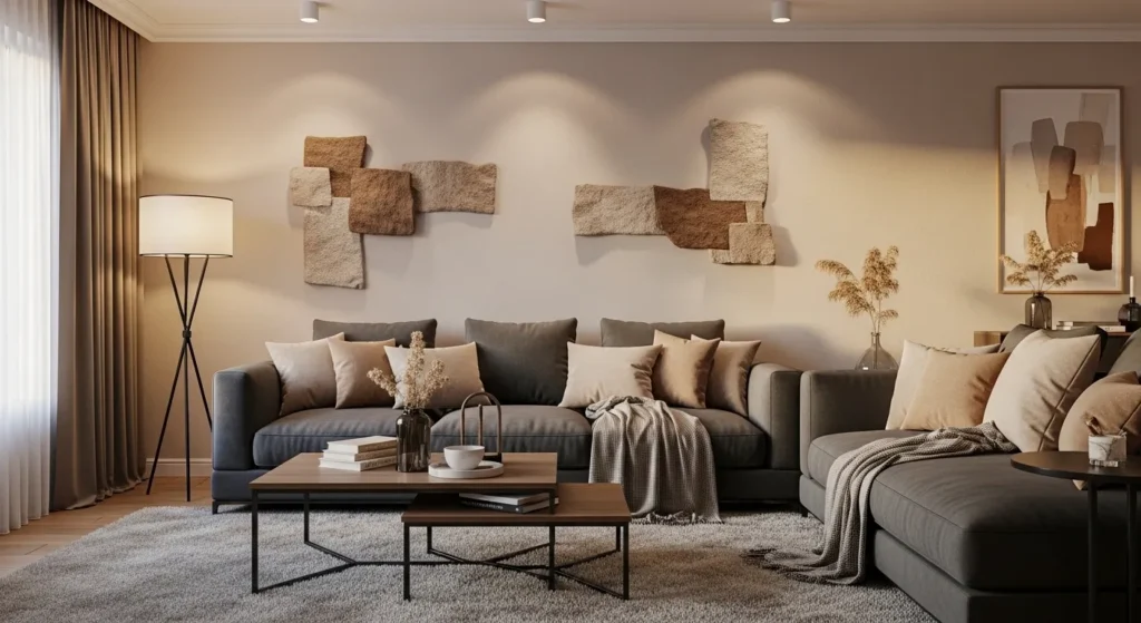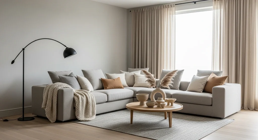 Small details matter. Add beige throws over a grey sofa to soften its appearance. Use multiple cushion textures like cotton, knit, and velvet. This instantly creates a cozy feeling and encourages relaxation. Neutral accessories are easy to replace seasonally. These small additions improve comfort without spending much money.