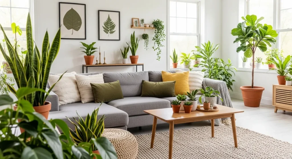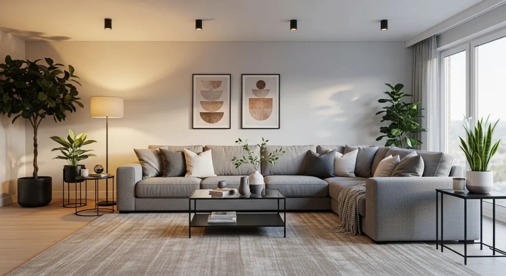 Green plants break the neutrality and bring life into the living room. A tall plant in a corner or small plants on shelves work well. Plants soften sharp furniture lines and improve mood. They also make the space feel healthier and more natural. Even one plant can dramatically improve the atmosphere.