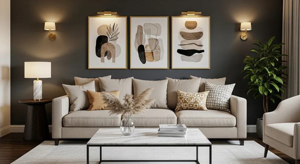 Choose simple artwork with neutral colors, abstract designs, or nature prints. Large art above the sofa works better than many small frames. Keep frames in black, wood, or soft gold finishes. Wall art adds personality without cluttering the room. Balanced decoration keeps the modern aesthetic clean and organized.