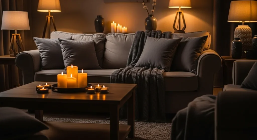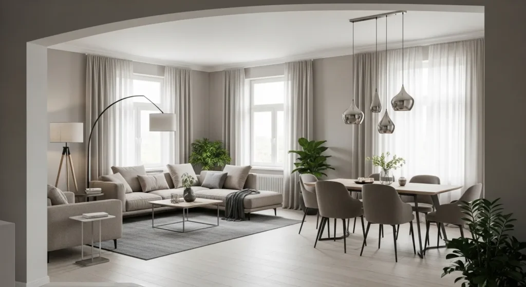 Lighting greatly affects how grey appears. Cool white bulbs can make grey look harsh. Instead, use warm white lighting to create a soft glow. Place table lamps beside the sofa and a floor lamp in a corner. Warm lighting enhances beige tones and creates a relaxing evening atmosphere. The room becomes comfortable for conversations and relaxation.