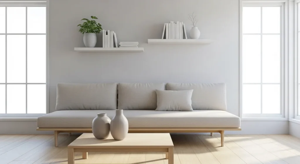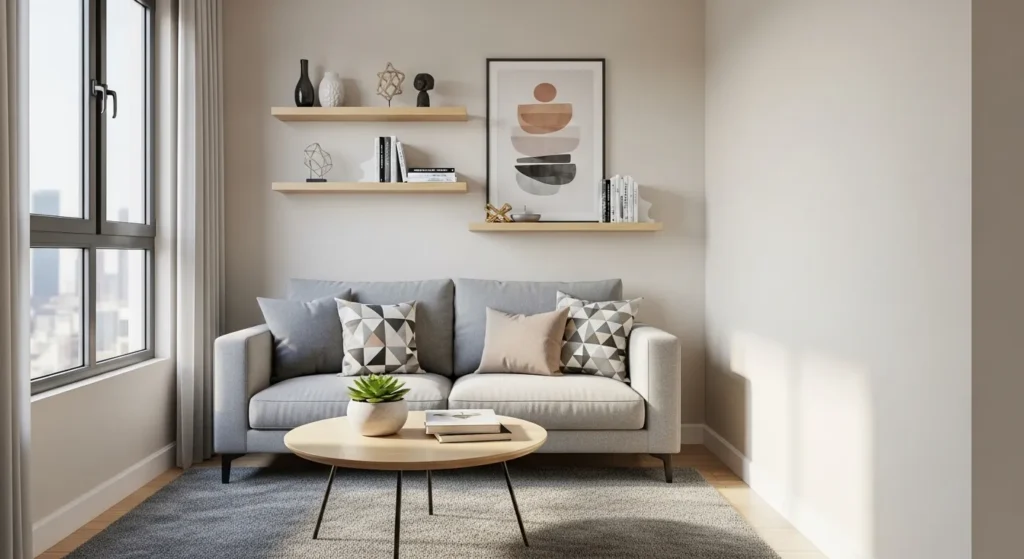 Floating shelves allow you to mix decorative pieces. Combine beige ceramics, grey vases, books, and candles. Keep the arrangement balanced and spaced. Avoid overcrowding shelves. Organized shelves make the room look styled and intentional rather than messy.