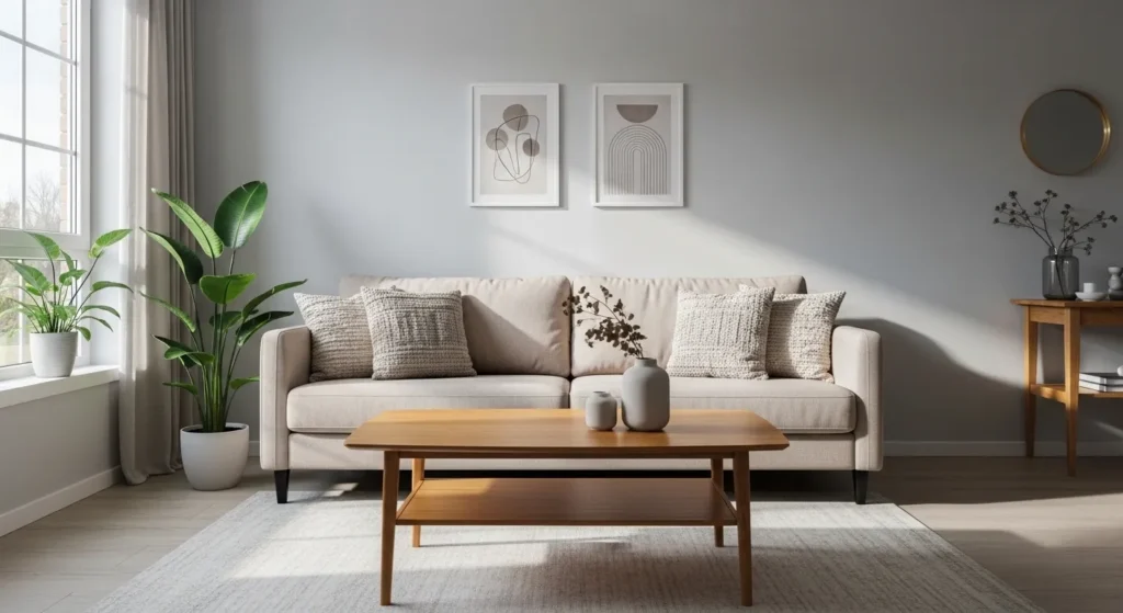 Wood naturally connects grey and beige tones. A wooden coffee table, TV stand, or shelf adds warmth and prevents the space from looking too modern or cold. Medium oak or walnut tones work best. Natural materials always make interiors feel welcoming. Even minimal decoration looks better when wood is included.