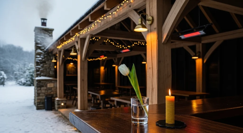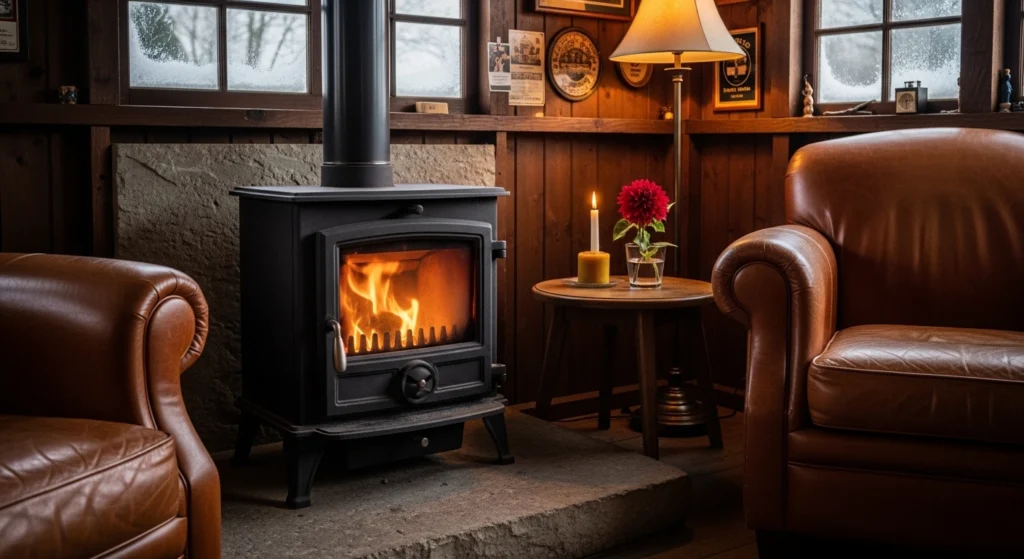 Winter inspiration is found in the “Soft Soul” of heavy textiles and the thermal anchor of a well-placed radiator or wood stove. We utilize the “Hard Architecture” of a cast-iron stove positioned on a limestone hearth to provide a “Glowy” focal point for cold evenings. The layout features low-profile cognac leather armchairs that offer Grounded Materiality and a sense of protective comfort. We style the side table with a glass half-filled with water and a single white dahlia next to a burning beeswax candle. This disciplined approach transforms the pub shed into a permanent winter anchor, where the scent of woodsmoke and the clarity of the design foster a state of deep, restorative peace.
