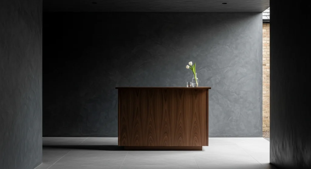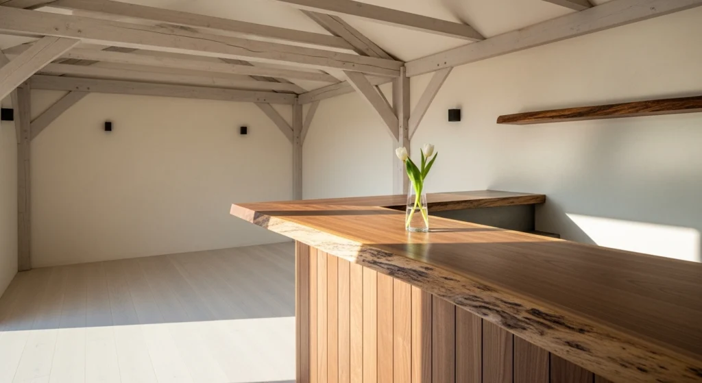 An inviting retreat is built upon the foundation of “Visual Silence,” where the structural integrity of the shed is honored through high-end finishes and a “Clean and Calm” layout. We utilize bone-colored Roman clay for the interior walls, providing a tactile, sueded backdrop that softens the traditional timber frame. The layout is anchored by a massive raw-edge walnut bar top, creating a sense of Stately Permanence that welcomes guests into a state of unburdened relaxation. To ground this social sanctuary, we style the bar with “Singular Intent”: a single glass half-filled with water holding a white tulip. This disciplined approach ensures that the interior feels expansive and sophisticated, bridging the gap between a rustic outbuilding and a professional-grade lounge.
