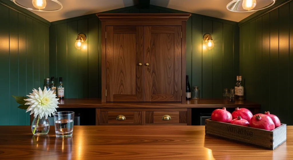 The classic green pub shed utilizes a British racing green or hunter green palette to evoke a sense of Stately Permanence and historical soul. We utilize dark walnut cabinetry and brass hardware to anchor the rich wall tones, creating a sophisticated and protective cocoon. The layout is optimized for a social atmosphere, featuring a central bar that facilitates a seamless “Visual Flow” between the host and the guests. We style the counter with a glass half-filled with water and a white dahlia next to a rustic wooden box of fresh pomegranates. This approach celebrates the joy of curated hosting, transforming the shed into a permanent and stately garden anchor for years to come.
