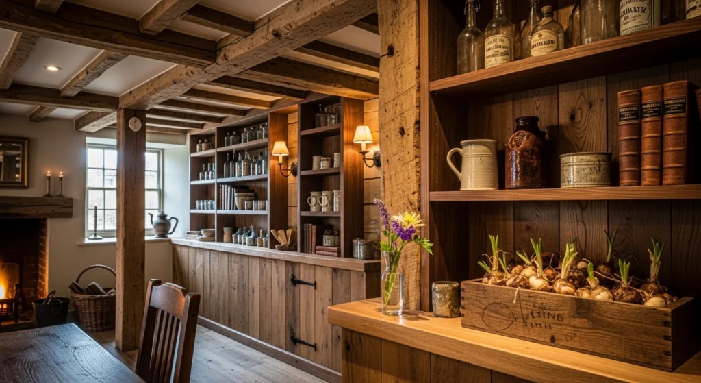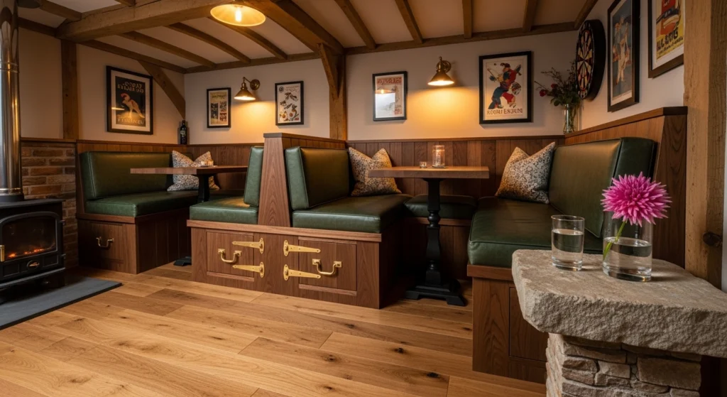 Classic cabin charm is achieved through the raw honesty of natural materials, utilizing rough-hewn timber and wide-plank oak to create a sense of Grounded Materiality. This “little pub” strategy focuses on the sensory experience of being in a protective wood cocoon, where the architecture itself provides warmth. The layout follows “Zero-Waste Geometry,” utilizing built-in shelving and benches to maximize the small footprint. We style a timber ledge with a glass half-filled with water and a wildflower next to a rustic wooden box of bulbs. This rustic, grounded approach ensures the pub feels like a permanent and restorative part of the garden, offering a timeless sanctuary for quiet connection and daily revitalization.