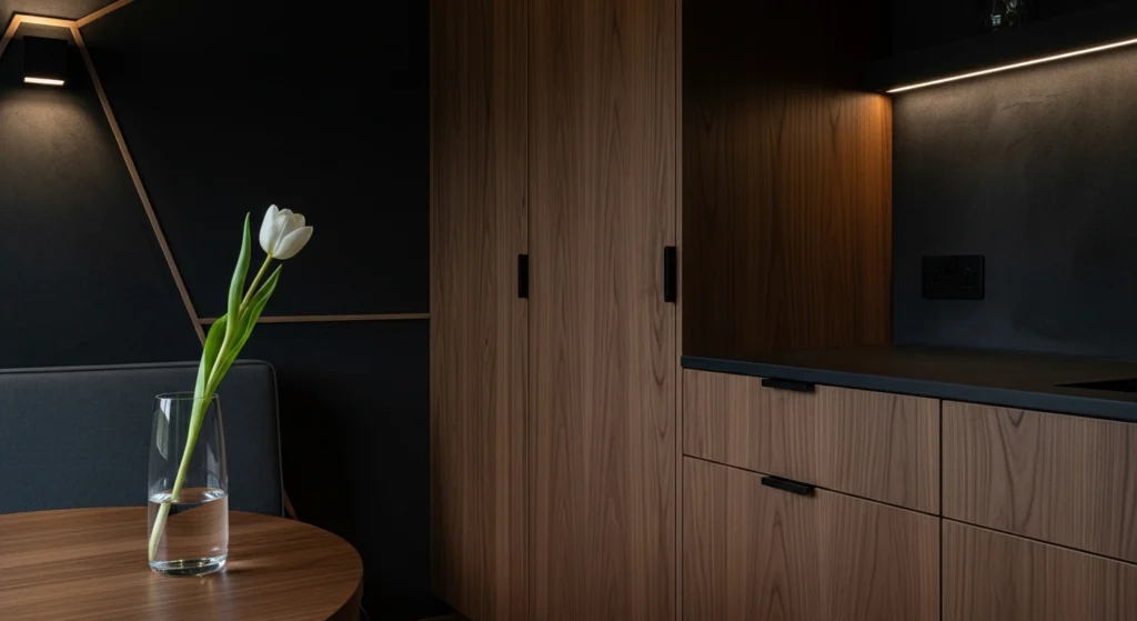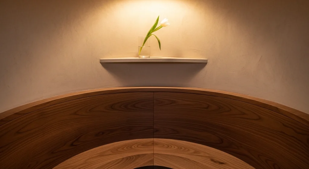 The Intimate Nook strategy utilizes the corner depth of the shed to install a custom walnut wrap-around bench, maximizing the footprint through “Zero-Waste Geometry.” The background features a sueded-texture Roman clay finish, which adds a layer of tactile warmth to the structure’s interior. We style this niche with a glass half-filled with water and a single long-stemmed white tulip to anchor the space in a state of curated discipline. This layout prioritizes the sensory experience of being “tucked in,” providing a sophisticated and permanent escape from the expansive garden while maintaining a high-fidelity and professional aesthetic that feels “Collected and Creative.”