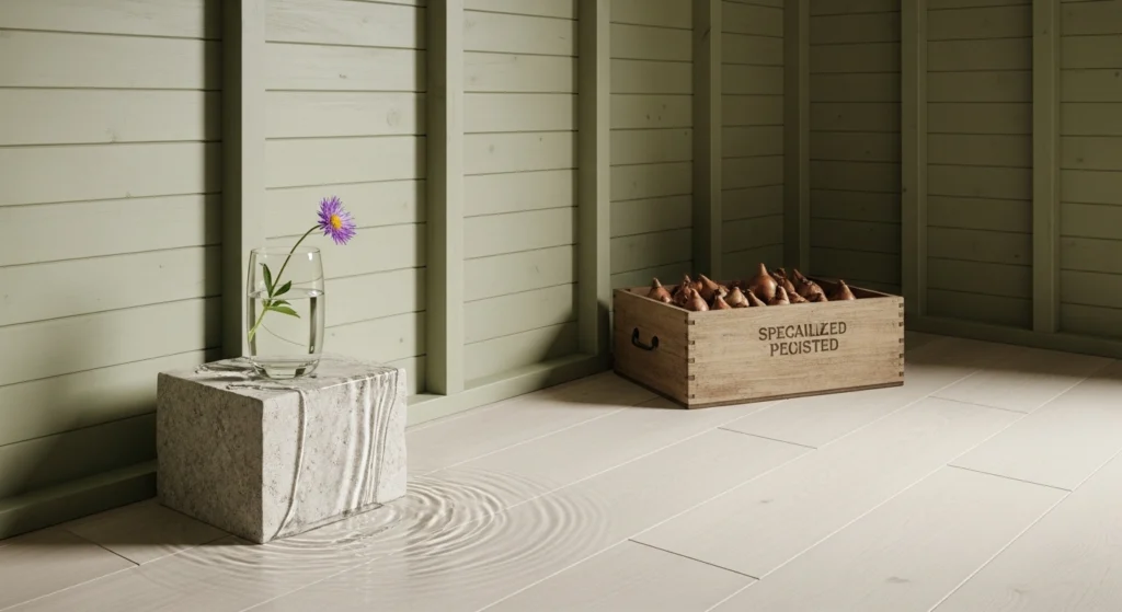 This final strategy utilizes the “Aqueous Serenity” of a nearby garden water feature to influence the interior aesthetic. We utilize a fresh, sage-toned Roman clay on the walls and wide-plank white oak on the floors to create a revitalizing and optimistic environment. The layout prioritizes “Visual Flow” and the multi-dimensional movement of light through the shed’s glass doors. We style a stone plinth with a glass half-filled with water and a wildflower next to a rustic wooden box of specialized bulbs. This commitment to seasonal revitalization ensures the space feels “Collected and Creative,” offering a high-end retreat that celebrates the intersection of human design and natural beauty in every glass poured.