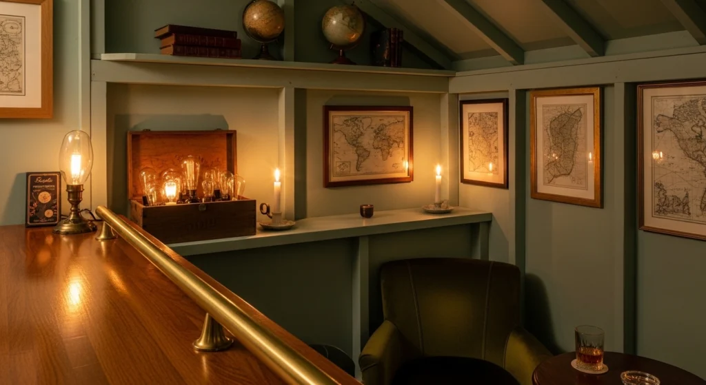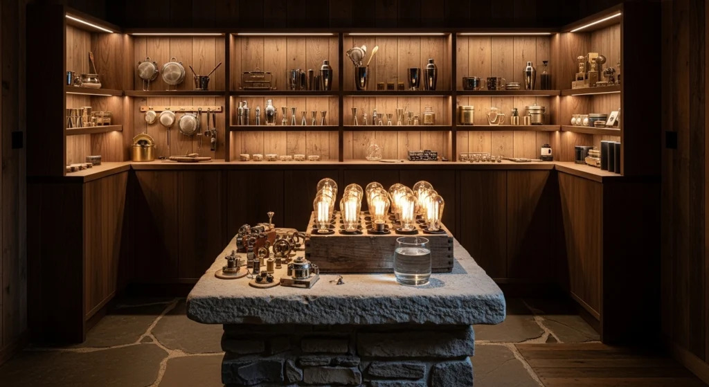Crafting a retreat involves a commitment to Grounded Materiality, where the tools of hosting—glassware, brass shakers, and stone trays—are treated as “Active Decor.” The layout features open walnut shelving that highlights the architectural soul of the “Hard Architecture” against a bone-colored plaster wall. We utilize “Visual Flow” by keeping the floor plane of wide-plank white oak entirely clear of unnecessary clutter. We style a central stone plinth with a rustic wooden box of specialized bulbs and a glass half-filled with water. This maker-focused design ensures the pub shed feels like a professional sanctuary, celebrating the art of the pour within a meticulously curated and disciplined environment.