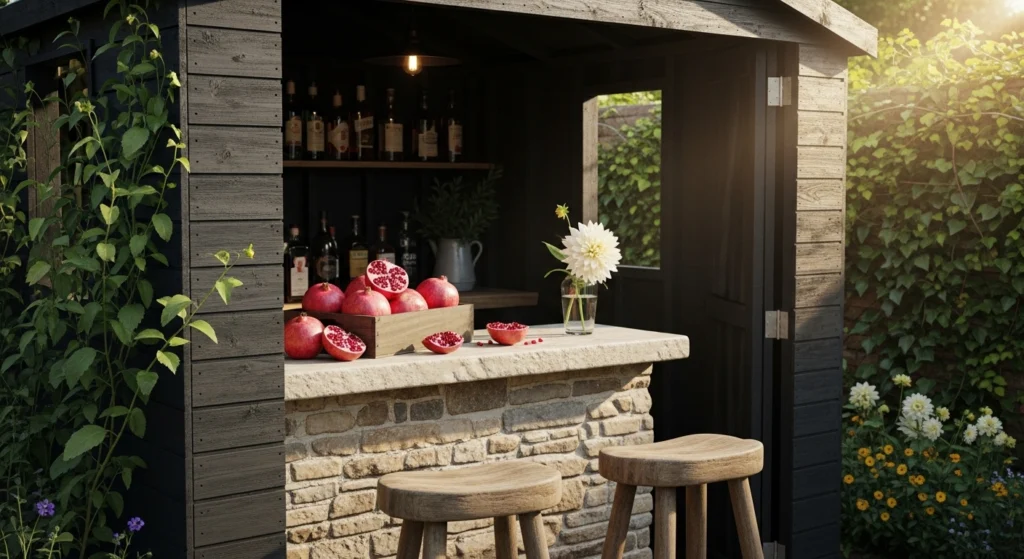 A green pub retreat utilizes botanical “Background Architecture” to blur the lines between the interior tavern and the Outdoor Garden. We finish the interior in a deep, moss-toned Roman clay, which catches the “Sun-Washed” light filtered through large glass panes. The layout is anchored by a stone-topped bar and timber stools, providing a sense of Stately Permanence that feels revitalized and fresh. We style the area with a rustic wooden box of fresh pomegranates and a single glass of water with a white dahlia. This garden-integrated strategy ensures the pub shed feels like a restorative cocoon, offering a high-end sanctuary that celebrates the intersection of human design and natural beauty.