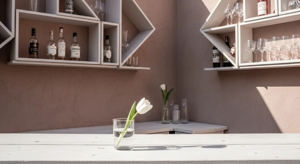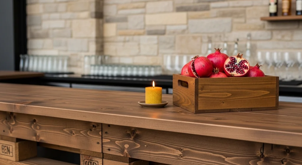 Elevating a pallet bar design requires a focus on Grounded Materiality, ensuring that reclaimed wood is treated with the same architectural respect as fine timber. We utilize deep walnut stains to unify the grain, pairing the rustic texture with the “Hard Architecture” of a limestone-clad back bar. This contrast between the raw and the refined reflects a “Collected and Creative” soul, avoiding the “Visual Noise” of DIY clutter. We style the service area with a rustic wooden box holding fresh spring pomegranates and a single flickering beeswax candle. This approach transforms a modest build into a high-fidelity tavern, where the material honesty of the wood serves as a quiet, professional backdrop for curated hosting.