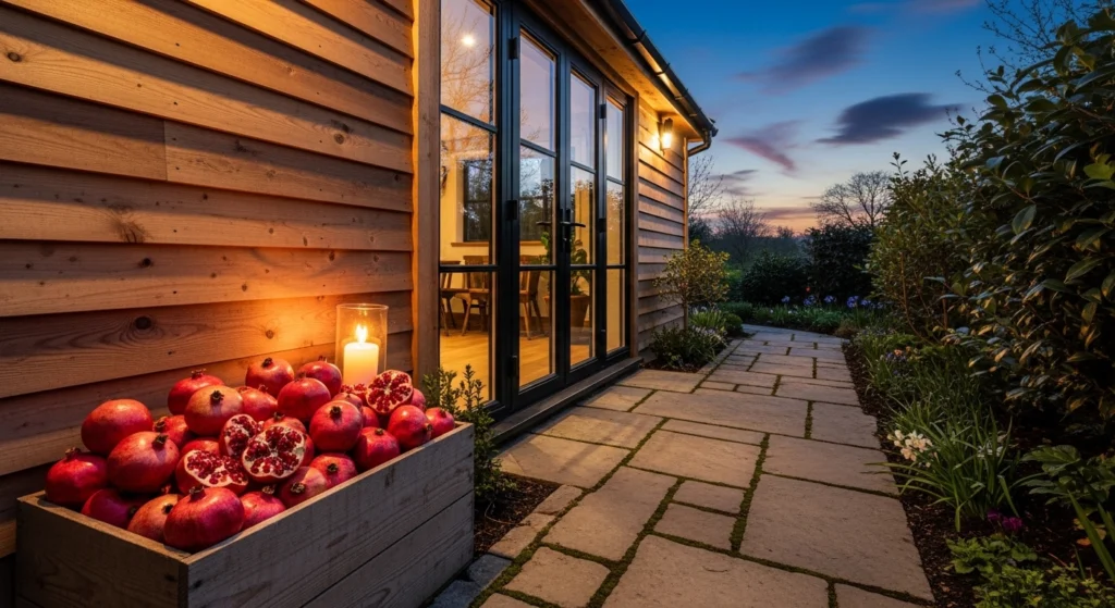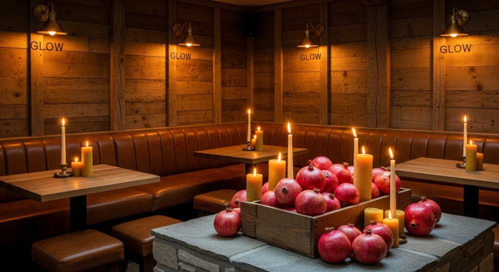 A warm and welcoming rustic pub shed utilizes the “Soft Soul” of the home, incorporating cognac leather and wool textiles to balance the “Hard Architecture” of the wood frame. The layout is optimized to capture a “Glowy” atmosphere, using brass sconces that cast a soft light against the textured timber walls. We style the central bar area with a rustic wooden box of fresh spring pomegranates and several burning beeswax candles on different stone levels. This approach turns the garden shed into a social sanctuary that feels like an expansive extension of the home’s Living Room, offering a tranquil retreat that honors the architectural soul of the property.