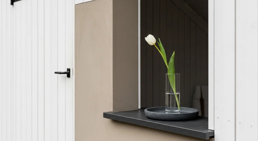 Sweetness and simplicity are found in the mastery of a limited palette, utilizing white-washed wood and soft taupe Roman clay to create a “Sun-Washed” energy. The layout is strictly minimized, featuring only the essential elements of a bar and two stools to preserve “Visual Silence.” We style a minimalist stone tray with a glass half-filled with water and a single long-stemmed white tulip. This disciplined and professional approach ensures the shed remains a high-fidelity sanctuary, reflecting the modern homeowner’s commitment to excellence and a “Clean and Calm” lifestyle within the garden landscape.