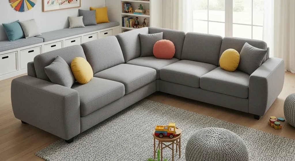 Select a durable, stain-resistant grey fabric. Add washable cushion covers and soft rounded tables for safety. Arrange seating to allow easy movement. Keep storage baskets nearby for toys or blankets. This design balances style with daily practicality.