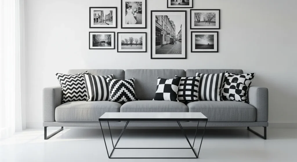 18. Grey Sofa with Black and White Contrast
