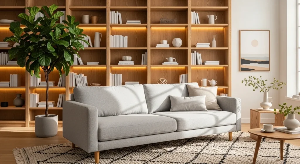 Place a sleek grey sofa in a clutter-free room with hidden storage solutions. Use a simple glass or black metal coffee table. Limit decor to one statement art piece and a floor lamp. Keep surfaces clean and organized. This style creates a peaceful and highly functional living area.
