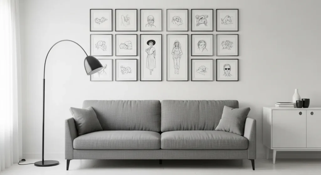 Hang a curated gallery wall above your grey sofa. Use black, wood, or gold frames for consistency. Choose art pieces with neutral or muted tones. This adds personality while keeping the base furniture simple. Make sure spacing between frames is balanced for a clean finish.