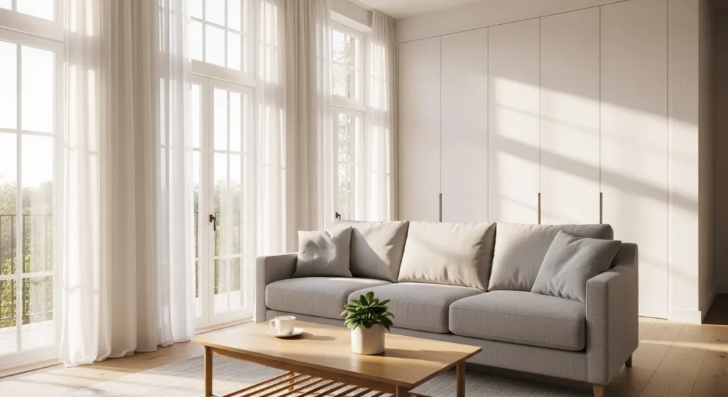 A light grey sofa paired with crisp white walls creates a fresh and open atmosphere. This combination reflects natural light and makes even small living rooms feel larger. Add a soft cream rug and light wooden furniture to prevent the space from looking too cold. Keep accessories minimal, such as neutral cushions and one large art piece. This style works especially well in apartments where brightness matters most.
