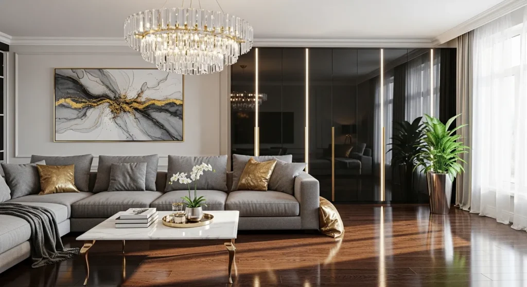 Add gold-framed mirrors, metallic lamps, or decorative trays. Gold pairs beautifully with grey and adds a touch of elegance. Balance the shine with soft fabrics. Avoid overusing metallics to maintain sophistication. This style works especially well in modern glam interiors.