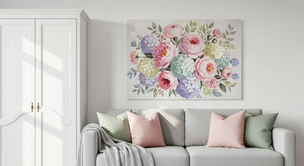 Add pastel cushions like blush pink or soft sage green. These tones gently brighten the space without overpowering the neutral base. Keep the rest of the decor light and airy. This idea works well in spring-inspired interiors. It keeps the room cheerful yet elegant.