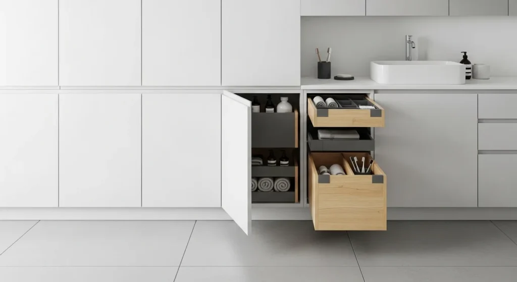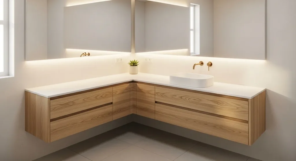 Corner sinks and vanities are excellent for compact spaces, using areas often wasted in traditional layouts. They keep traffic flowing while still providing essential storage and countertop space. A corner setup also opens the rest of the bathroom, making it feel more airy and uncluttered.