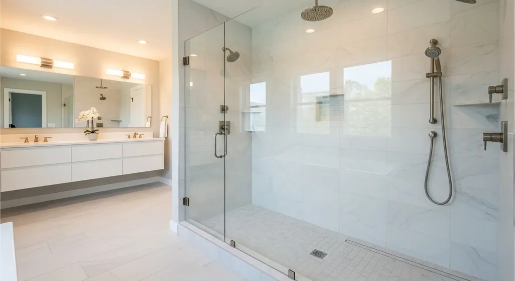Partitions maintain openness and separate wet areas. Frameless glass preserves visual space, making bathrooms feel larger and brighter.