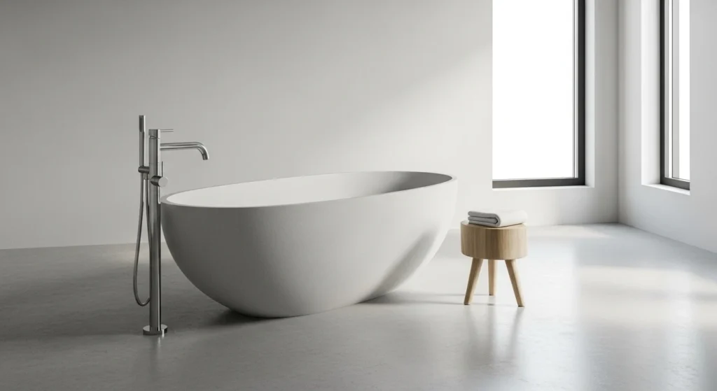A freestanding tub creates a calm focal point. Curved, minimalist shapes work best in modern bathrooms and feel spa-like.