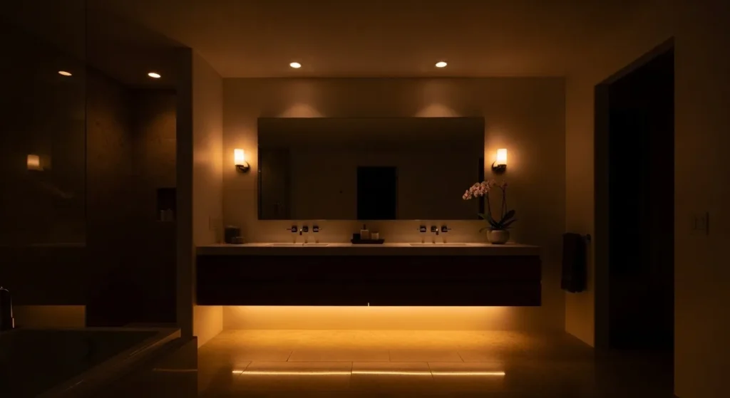 Layered lighting balances functionality with mood. Recessed ceiling lights, sconces, and under-cabinet LED strips combine to create a calming, spa-like atmosphere.