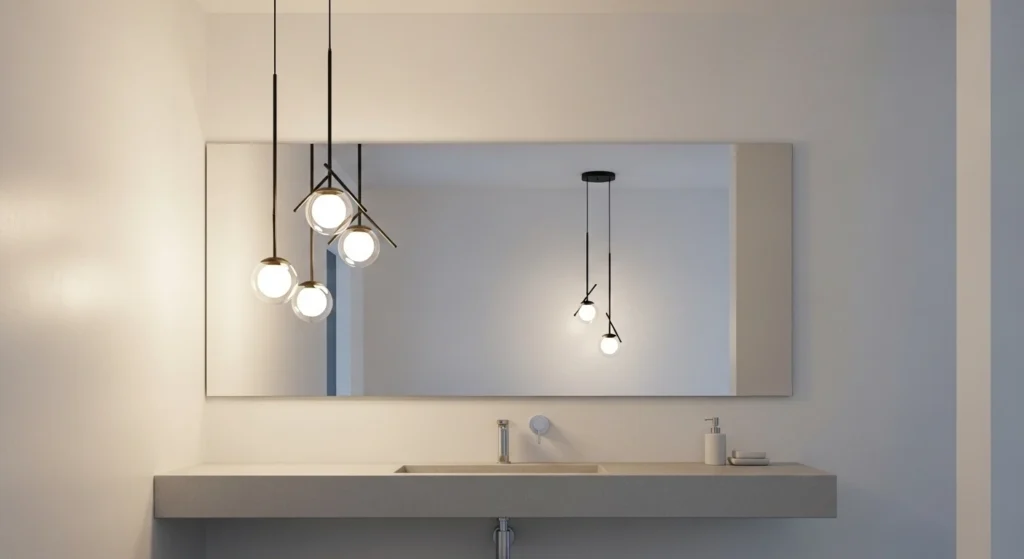 Modern pendant lights above vanities add sophistication and focus without clutter. Simple designs in glass, metal, or natural fibers complement clean lines.