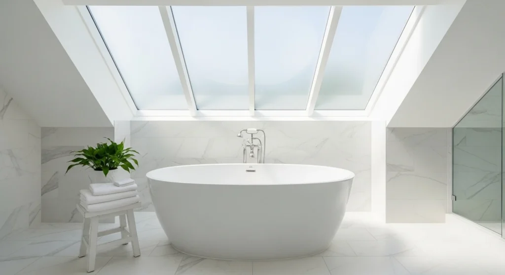 Windows, skylights, or frosted panels bring in natural light, enhancing serenity and openness. Natural light highlights textures, colors, and fixtures beautifully.