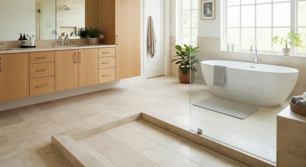Natural stone floors such as marble, travertine, or limestone instantly elevate a bathroom. They bring texture, elegance, and a timeless feel to modern spaces while grounding the room with an organic touch. Light-colored stones expand the visual space and maintain a calm environment.