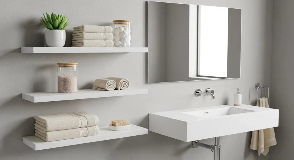 Style Note: Open shelving works best in medium to large bathrooms or above floating vanities.
