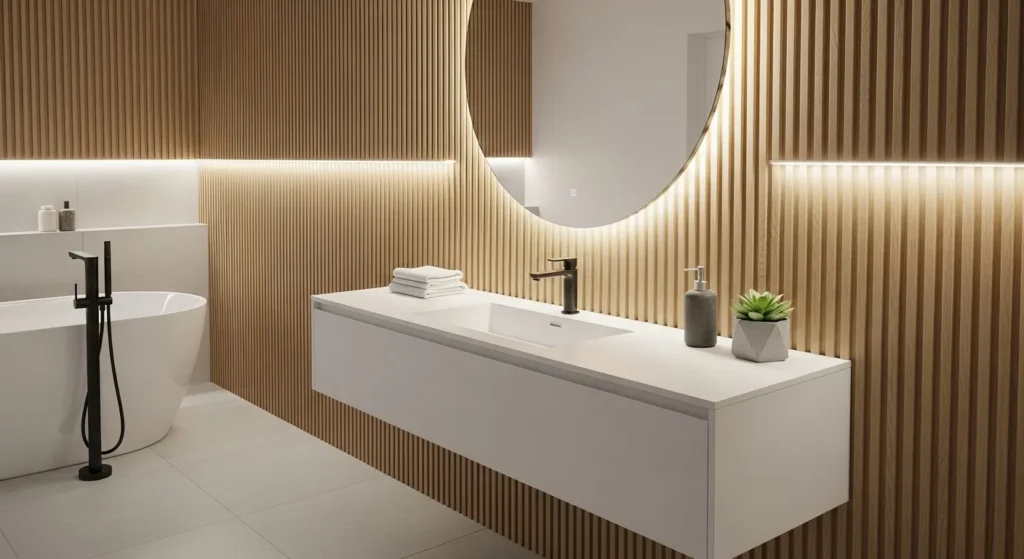 Wood adds warmth, texture, and visual interest to a modern bathroom. Light oak, walnut, or bamboo can be incorporated in vanities, shelves, or even wall panels to soften the minimalism. Wood paired with neutral tones maintains a calming atmosphere.