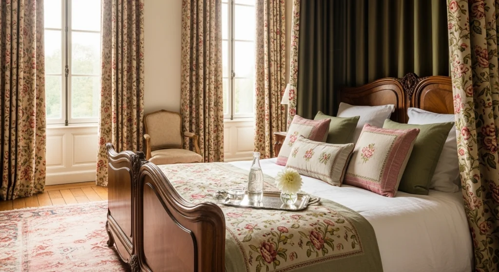This retreat feels like a quiet escape into a Parisian dream, where floral drapery and a carved headboard create a grand, romantic presence. The “Hard Architecture” of the countryside château style is softened by muted rose tones and embroidered cushions. We style a vintage tray on the bed with a glass half-filled with water and a single dahlia, reflecting a lifestyle of luxury and stillness. This room is a perfect example of how Modern Chic can embrace old-world artistry, resulting in a serene haven that feels both stylish and timelessly curated.