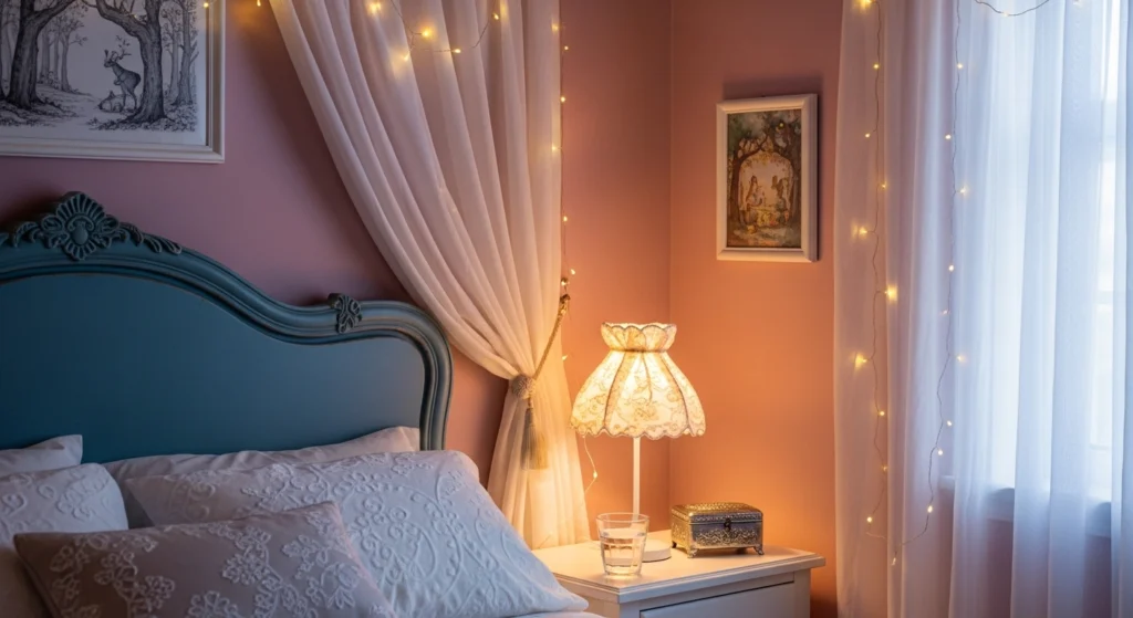 A Pastel Daydream utilizes draped curtains and twinkling lights to create a whimsical, “Sun-Washed” atmosphere. The “Soft Soul” of the room is highlighted by floral bedding and ruffled throws in sweet pastel tones. We style the nightstand with a glass half-filled with water and a single long-stemmed white tulip next to a lace lampshade. This fairytale-inspired sanctuary provides a gentle and comforting retreat, wrapping the inhabitant in pure, pastel-perfect charm and optimistic energy.