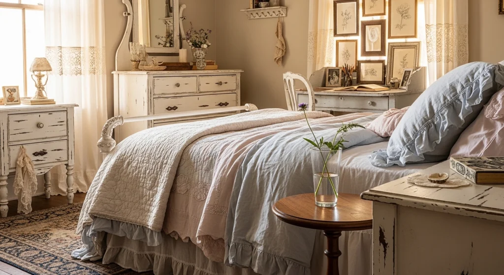 This escape utilizes vintage textures and weathered furniture to create a dreamy, nostalgic retreat. The “Soft Soul” of the room is expressed through ruffled linens and dainty lace, adding character without disrupting the “Visual Silence.” We style the space with a glass half-filled with water and a single wildflower on a distressed walnut table. This shabby chic sanctuary wraps the inhabitant in a sense of calm and whimsy, offering a restorative cocoon that feels both lived-in and elegantly curated.