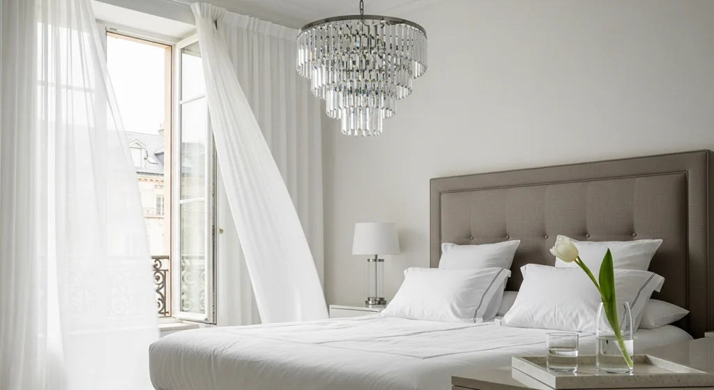 Airy Neutrals utilize tall sheer curtains to bathe the room in a gentle glow, highlighting every high-intent detail. The layout features an upholstered headboard and vintage-inspired Home Essentials like a sculpted lamp base and a sparkling chandelier. We style the bedside table with a glass half-filled with water and a single long-stemmed white tulip. This combination of “Soft Soul” and modern lines creates a tranquil sanctuary that feels light, refined, and effortlessly stylish.