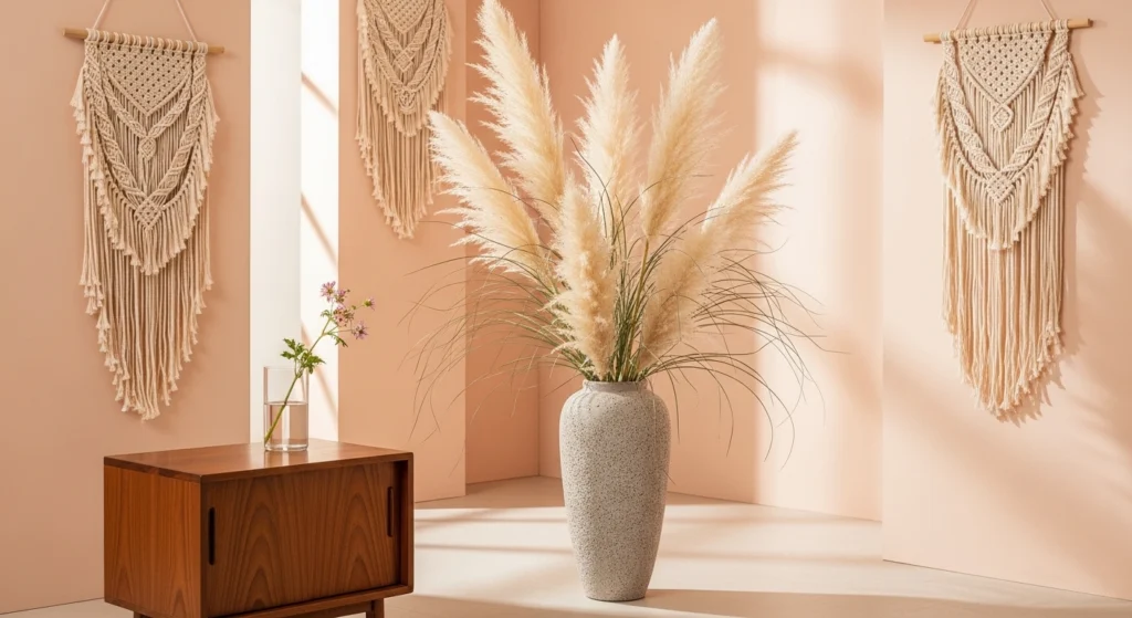 Boho Shabby Chic Bliss brings an effortless charm to the bedroom through peach tones, woven textures, and macramé wall hangings. The layout utilizes pampas grass to add height and softness, echoing the “Sun-Washed” energy of an Outdoor Garden. We style the space with a glass half-filled with water and a wildflower on a vintage-style walnut side table. This airy and feminine room acts as a “Social Sanctuary” for rest, providing a warm and inviting retreat that feels like a hug in room form.
