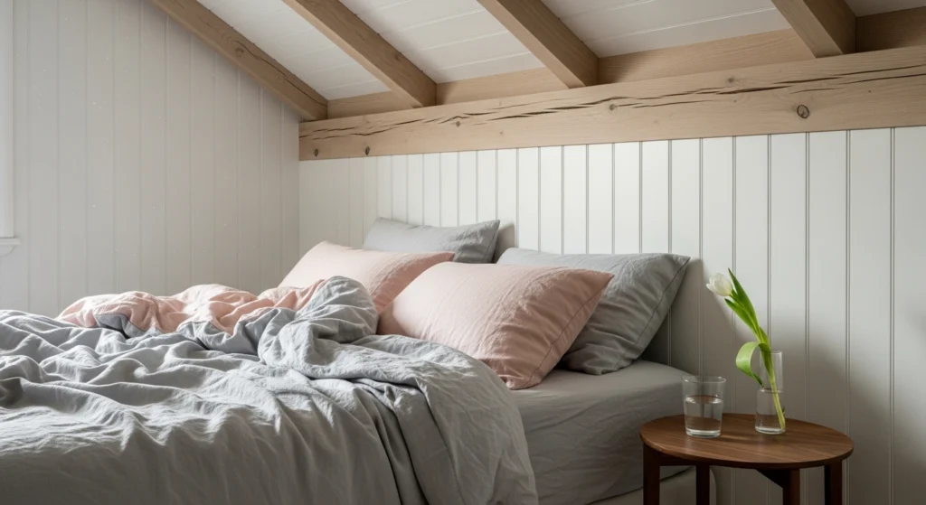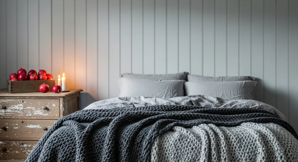 This haven embraces the beauty of soft neutrals, utilizing vertical paneling to add subtle texture to the “Background Architecture.” The crisp white and gray palette keeps the space light and airy, fostering an environment of “Visual Silence.” We style a distressed dresser with a rustic wooden box of fresh spring pomegranates and a single flickering candle. This layout prioritizes “Grounded Materiality,” allowing the layered textures of linen and wool to shine in a quietly sophisticated and permanent way.